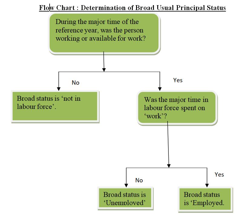 Usual principal activity status: With the broad activity status identified for a person, detailed activity categories will be assigned on the basis of relatively long time spent on a detailed activity. For example, suppose person A, in the example given above worked in household enterprises without hiring labour for 3 months and worked as casual labour for 2 months, then his usual principal activity status would be, worked in household enterprise (own account worker).