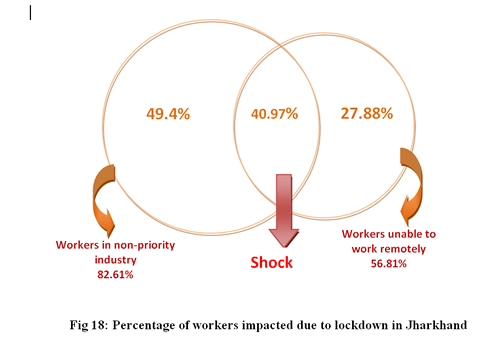 WE have estimated the shock in the labour market due to imposition of Lockdown in Jharkhand. For this we have used PLFS 2017-18 (the latest data available), NIC 2008 Code which PLFS uses and Census of India 2011. We have assumed that there is no change in the employment structure in 2020 from 2017-18. It seems to be a valid assumption because the employment structure does not change in such a short span of time. We utilize two measurements to assess the shock