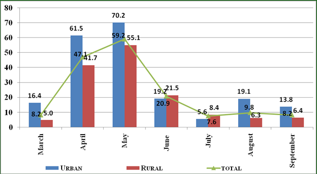 Unemployment in Rural and Urban Areas of JharkhandThe unemployment in urban area was more than that in the rural areas of Jharkhand between March and May, 2020. This usually is the case during agriculturally lean season, when a large number of labourers, in absence of sufficient work opportunities in the villages, migrate from the rural areas of state to urban areas. In the month of April and May 2020, both the rural and urban unemployment increased, but the rural unemployment increased faster than the urban unemployment, causing an increase in the gap between the rural and urban unemployment. This happened because, in absence of work during the lockdown, some of the migrant workers returned to their homes during these two months. The unemployment in both the rural and urban areas decreased in June and July with the relaxation of lockdown and resumption of some of the economic activities. It decreased at a faster rate in urban areas than in the rural areas. June and July are agriculturally busy season for the state. In expectation of getting engagement in Kharif sowing and other related works, many labourers came back to their villages. Some of them went back urban areas after the busy agricultural operations, causing a reversal of the trend.